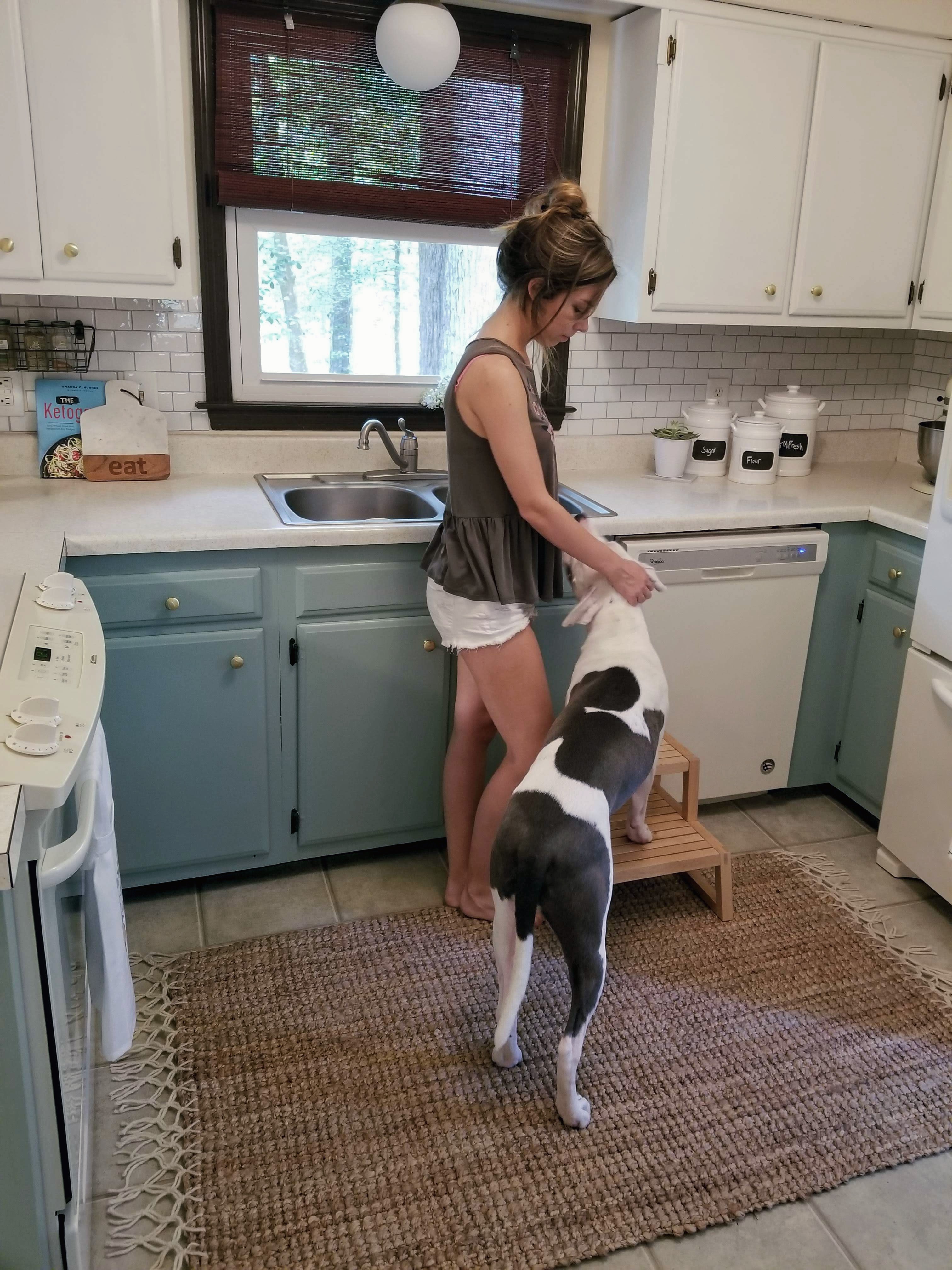 After painting, changing hardware, changing lighting, and adding finishing details, the older countertops and white appliances almost seemed intentional. The details that made this kitchen come together were the little touches, like the spice rack I hung on the wall near the stove, and the rug. I am a rug addict. I love a good rug – so I made sure to add a durable and pet friendly rug in my kitchen. I don’t care for the vinyl tiles – however neutral they are – I wanted them covered. I’ve always loved nuLoom rugs, and after much research, I found a perfect rug for our space. Of course – it’s from Amazon too! If you haven’t check out nuLoom rugs yet – I highly recommend them, especially if you have pets! Check out the nuLOOM Hand Woven Fringe Area Rug in my kitchen! (Best part – it was under $50)