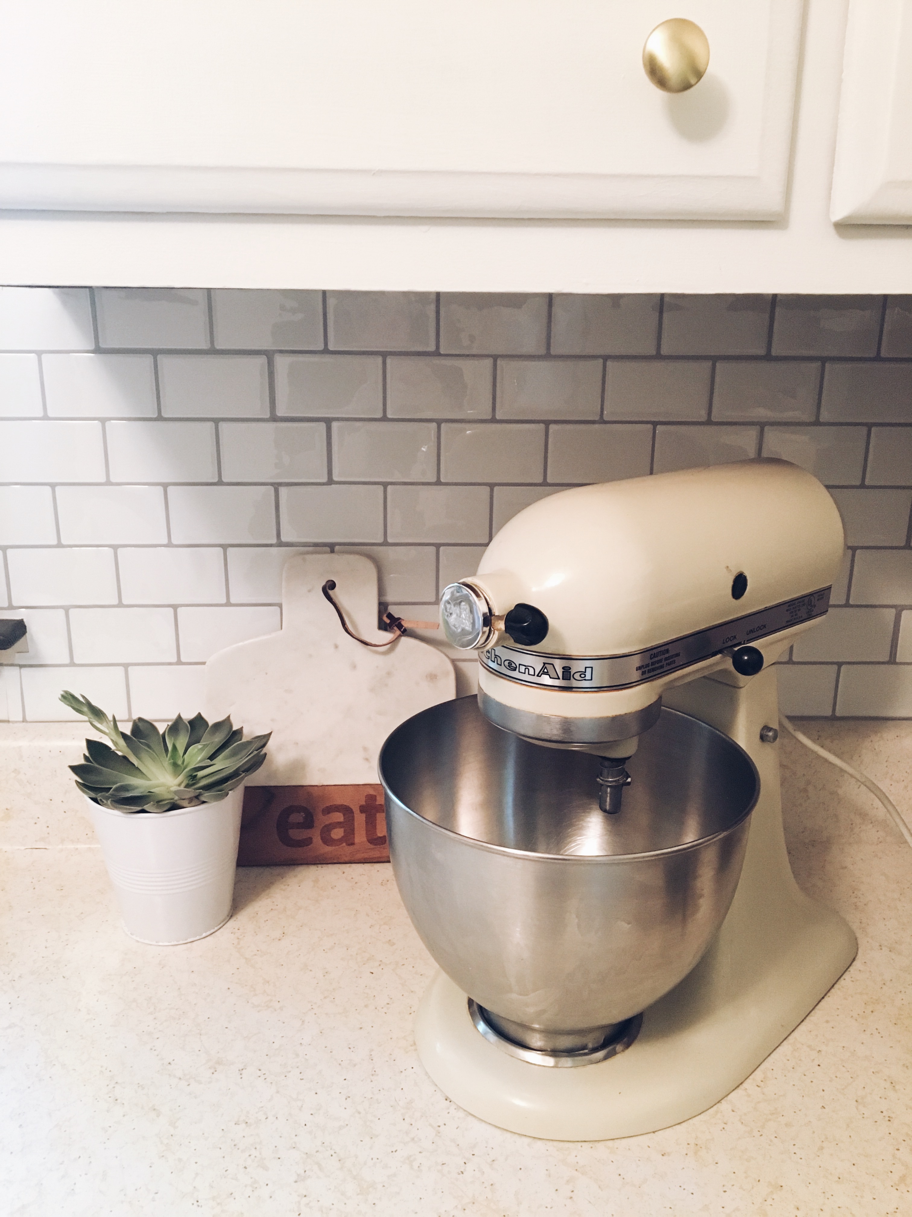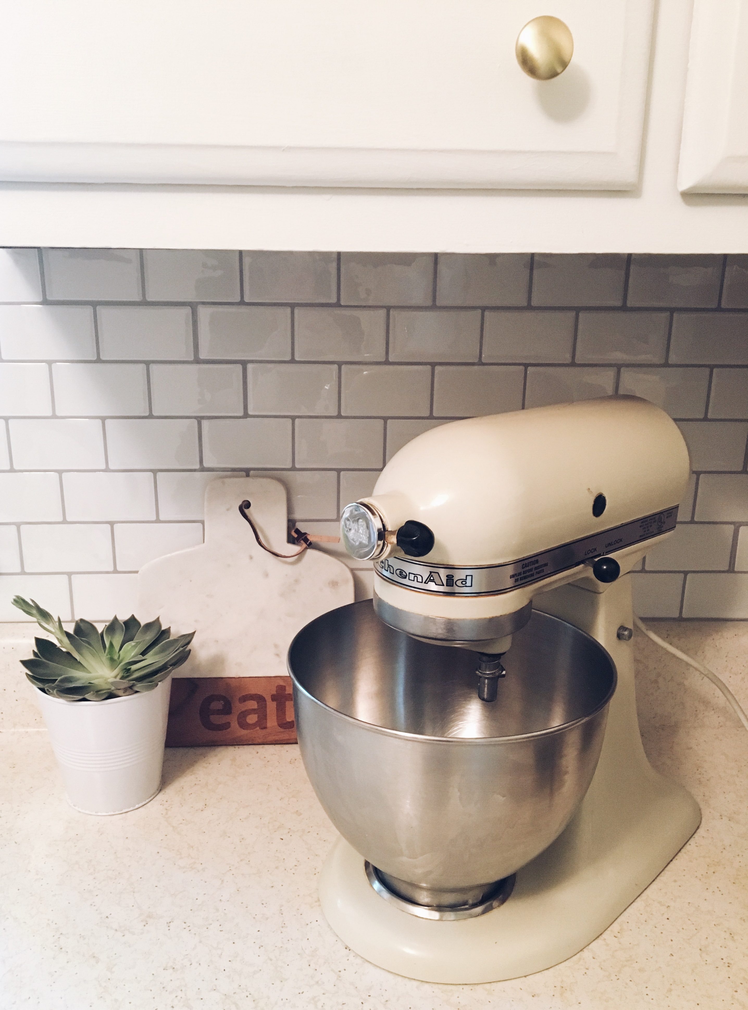 Ever since I started thinking about a kitchen makeover, I knew I wanted subway tile. I’ve always loved the classic and clean look, and felt it went with so many styles. My style has changed slightly over the years, so I knew if I wanted to switch out the kitchen decor in the future, that subway tile would still look amazing! That being said, my $400 budget obviously didn’t allow for real subway tile and labor so I had to get creative. I knew about peel and stick backsplash, but was super skeptical…until I found Tic-Tac tile. This product changed my life (okay that’s an exaggeration..but I HEART IT) So I ordered a bunch of the subway tile product and slapped it up on the wall..and I have no regrets. Check out a more detailed blog post I wrote on this process and where to buy it here.