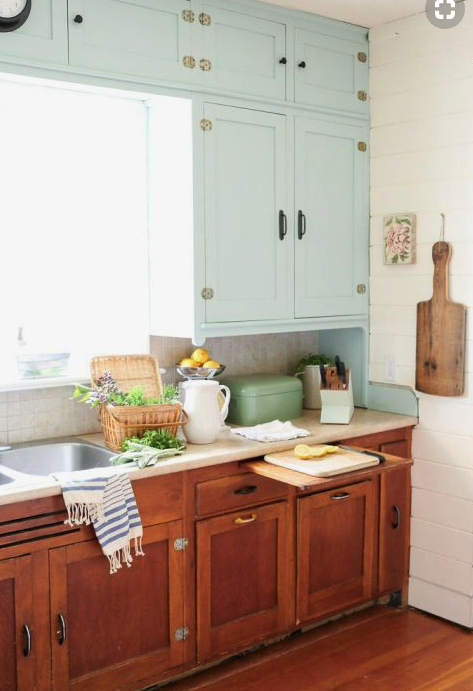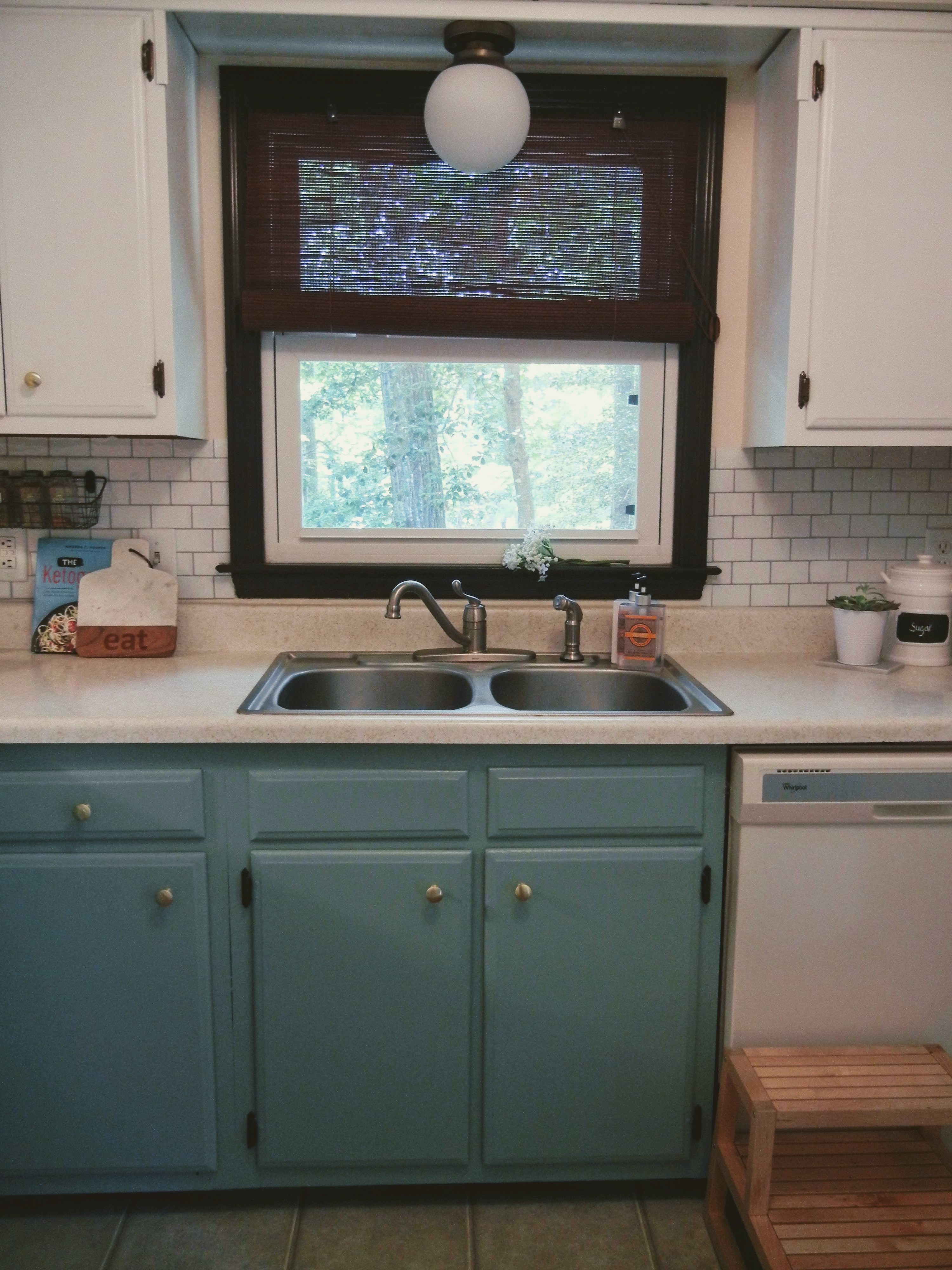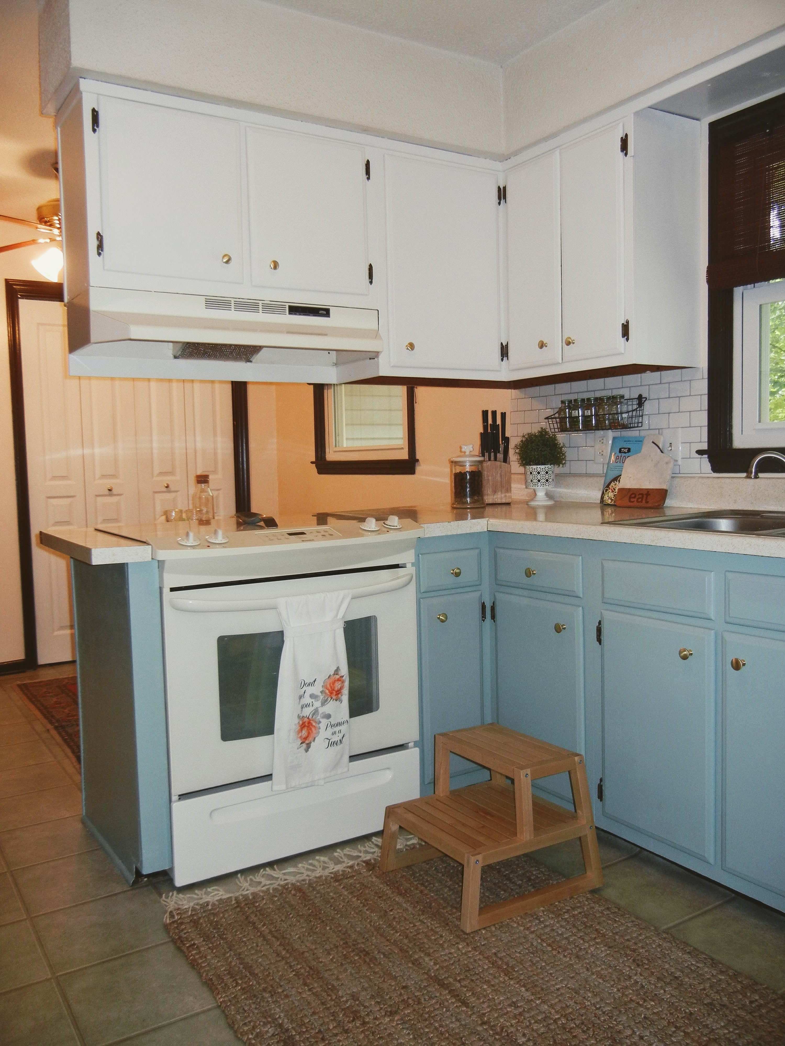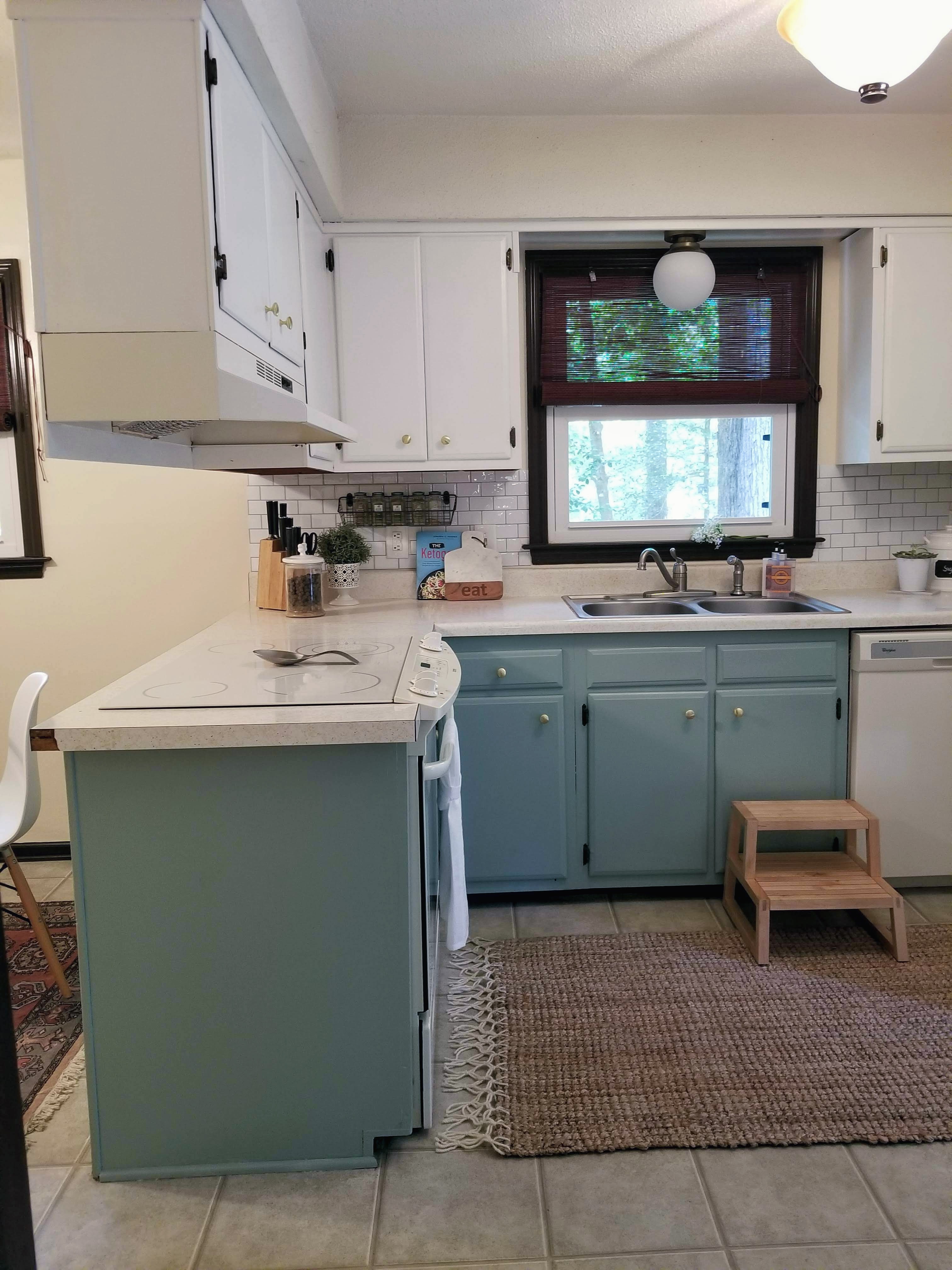 Let me be the first to say..I spent the weeks between the first showing and our move in date obsessing over cabinet colors. I went back and forth what seemed like a million times about the colors I wanted. I was in love with navy for a while, then black, then all white..I even thought about knocking all the uppers down. I KNOW how overwhelming colors are..and that’s coming from someone who does handfuls of paint color consultations a month. Nonetheless, I went back to my original gut instinct – my love of the seafoam-green-blue. I ended up buying Sherwin William’s Bohemian Lace and Halcyon Green. Boho Lace for uppers and Halcyon Green for lowers! I just bit the bullet and did it. I debuted a sneak peak on my Instagram . My advice – go bold. I’ve only ever regretted being too safe with my decor 😉