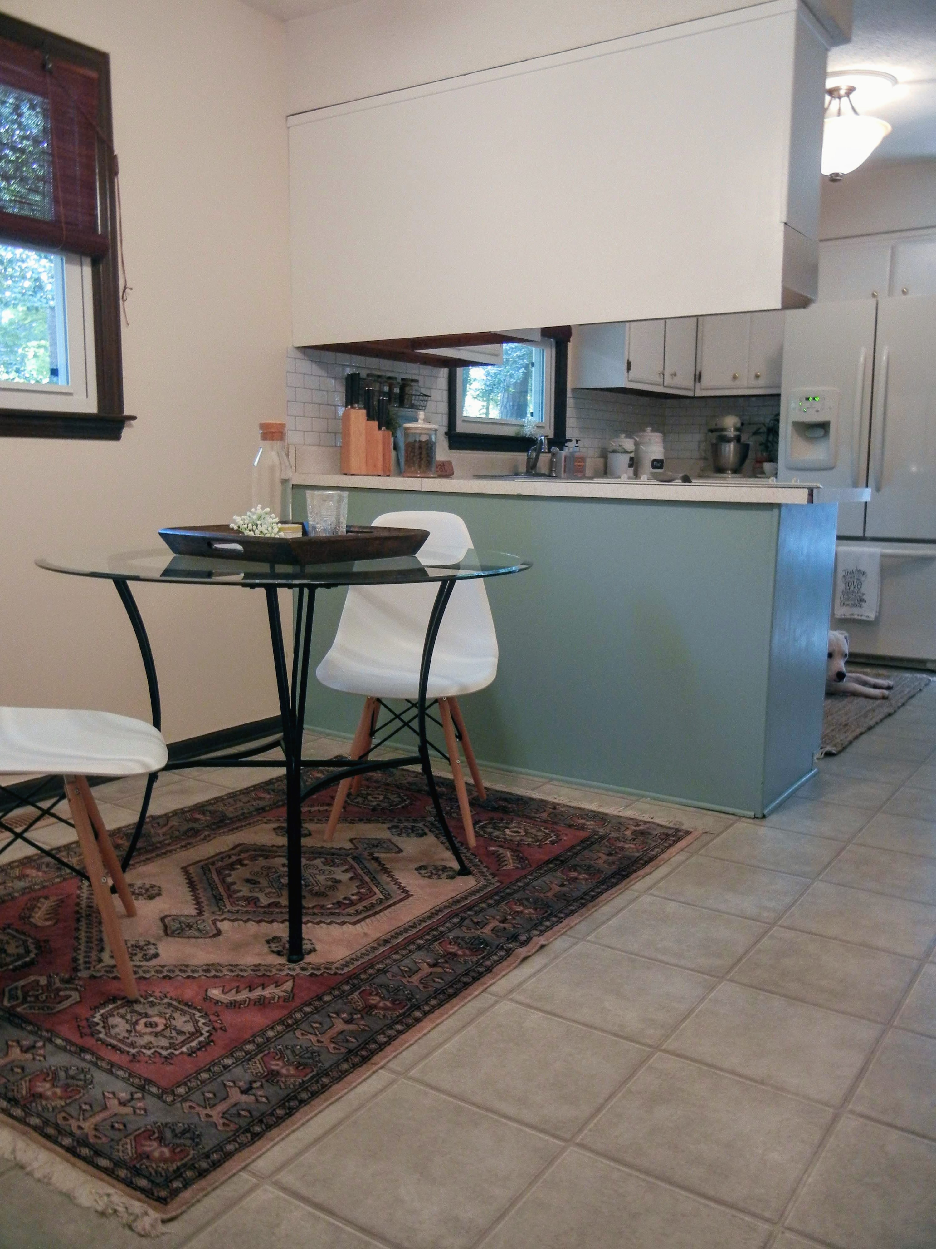 After painting, changing hardware, changing lighting, and adding finishing details, the older countertops and white appliances almost seemed intentional. The details that made this kitchen come together were the little touches, like the spice rack I hung on the wall near the stove, and the rug. I am a rug addict. I love a good rug – so I made sure to add a durable and pet friendly rug in my kitchen. I don’t care for the vinyl tiles – however neutral they are – I wanted them covered. I’ve always loved nuLoom rugs, and after much research, I found a perfect rug for our space. Of course – it’s from Amazon too! If you haven’t check out nuLoom rugs yet – I highly recommend them, especially if you have pets! Check out the nuLOOM Hand Woven Fringe Area Rug in my kitchen! (Best part – it was under $50)