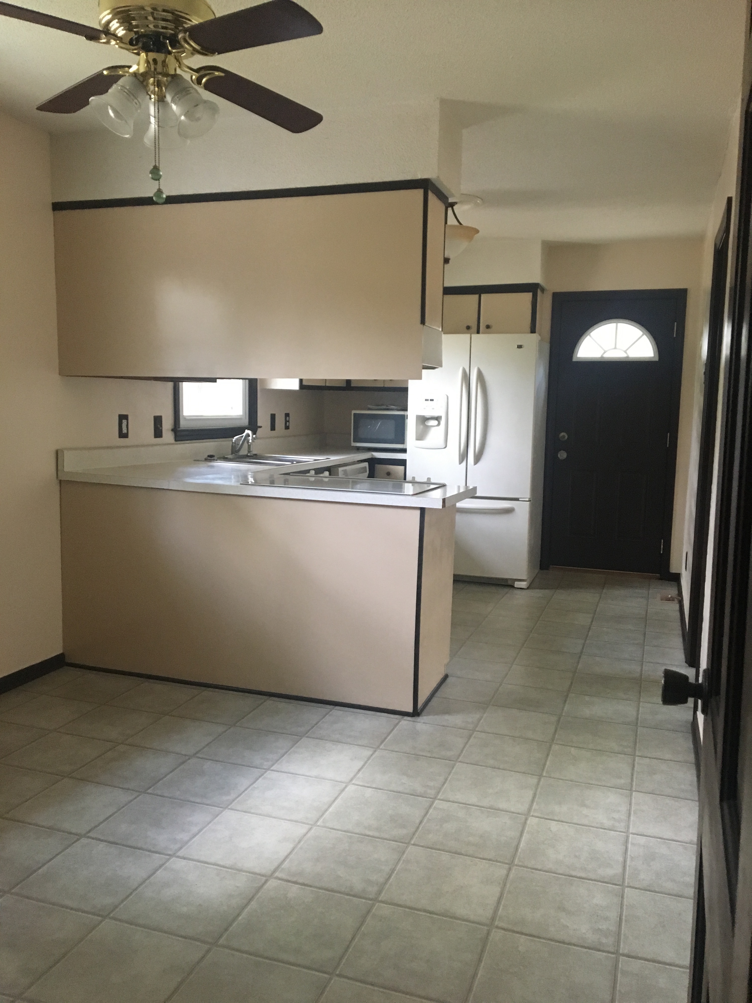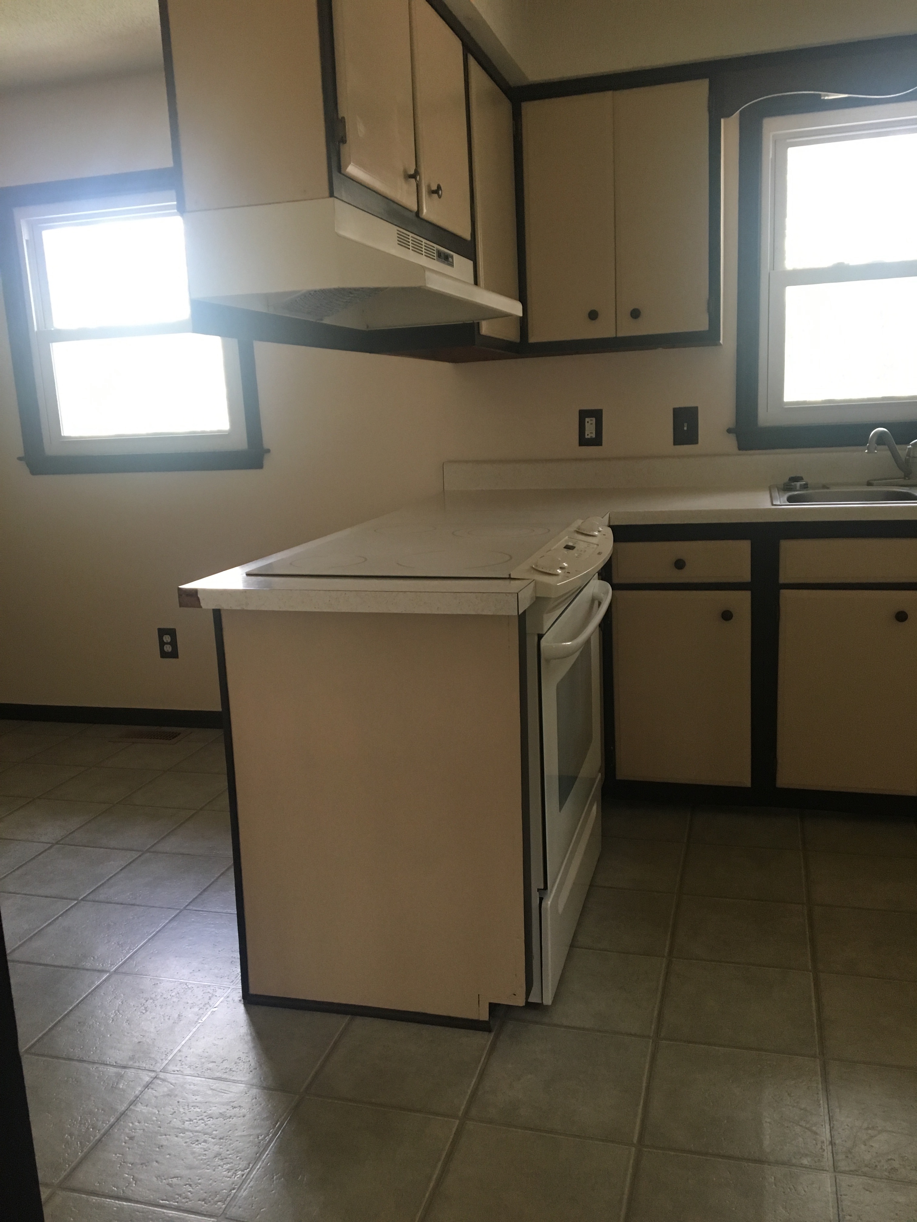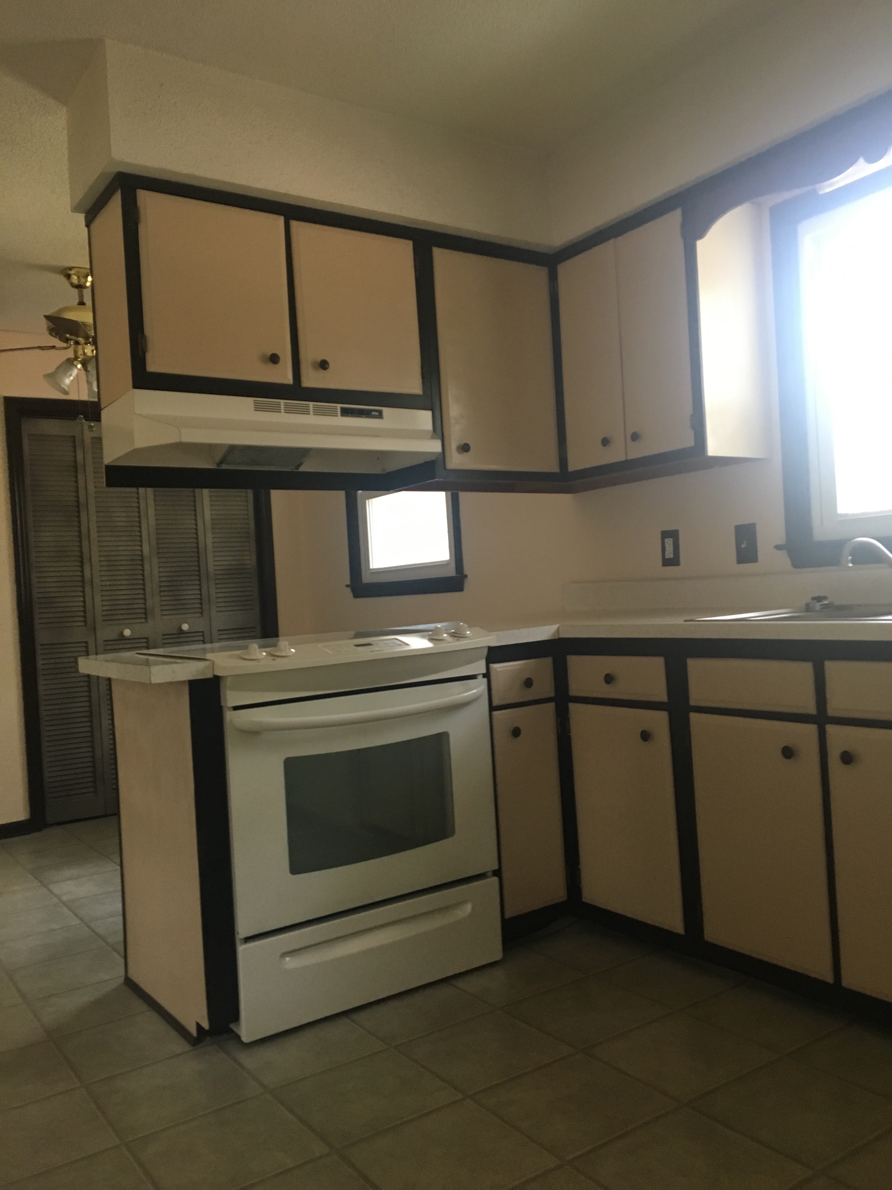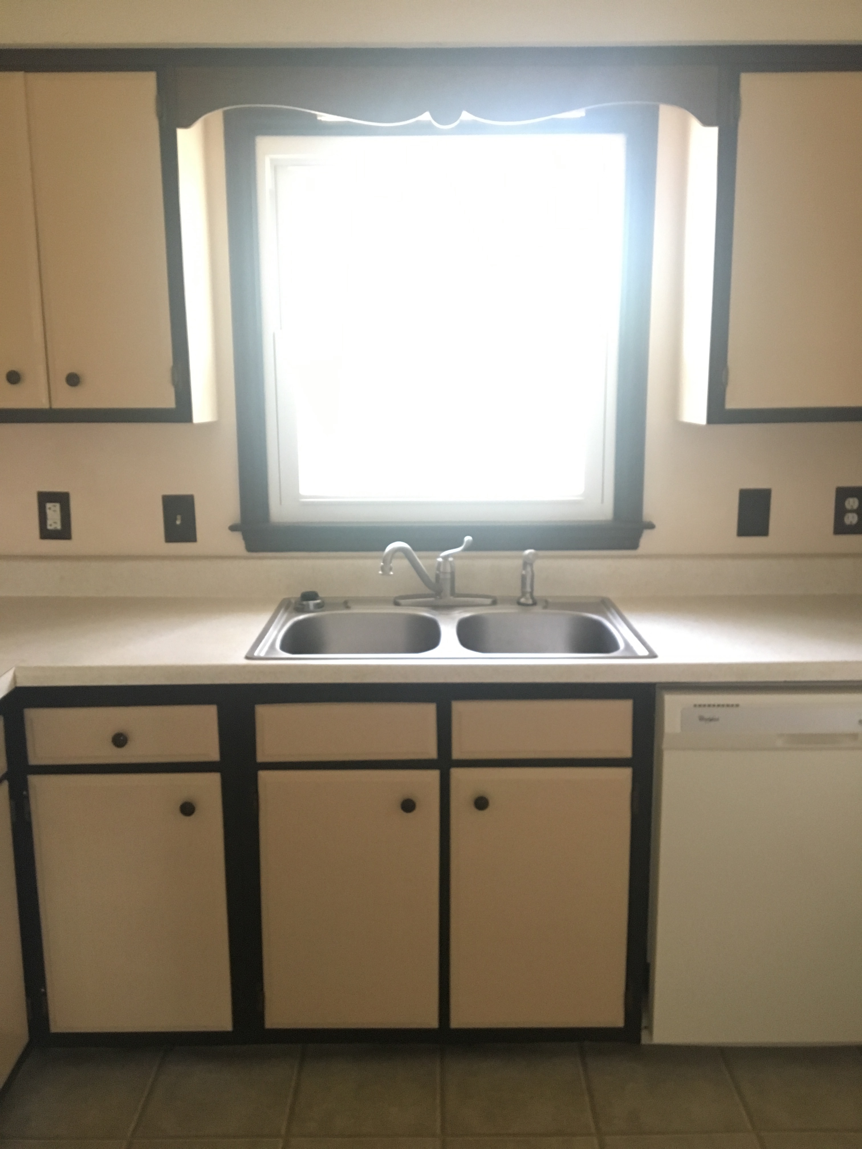 Oh..the kitchen! The cabinets were two-toned..and not the trendy kind you are imagining. The cream and brown paint that covered the cabinets made me want to shower immediately…but I also knew this was the first room that needed my love. Another thing I knew – being only 2 years of out college, and this being my first house, my budget was gloriously tiny. At work, I had won $300 in Amazon gift cards, so I decided that those gift cards, plus another $100 would be what i’d work with. I honestly didn’t know if I could do it for under $400 but there wasn’t really an option to expand the budget, and it sure wasn’t an option to keep the puke-esque colored kitchen the way it was. No ma’am.