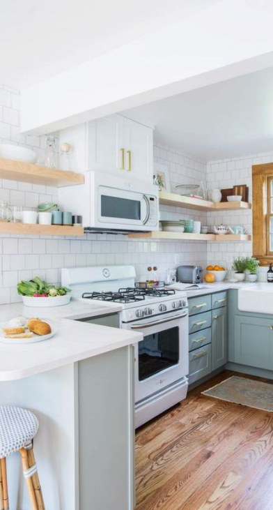 I knew I wanted white cabinets, because this space desperately needed brightened up, but I also wanted color. I’d been crushing on Farrow & Balls Pigeon color for quite some time. At nearly $70 a gallon though, I had to find an alternative, so I colored matched at Sherwin Williams, and ended up with Halcyon Green [which was even lovelier to me.] The house was built in 1974, and I didn’t want to get rid of all the character of that groovy decade, which is why I chose such a bold cabinet color! I wanted to add back in some vintage touches, and have always loved brushed brass, so decided to keep the brushed brass in the space. I also have always loved subway tile backsplash, because it goes with everything – every color, style and time period. Here are a few images from my Pinterest that sparked my design heart and were my initial inspiration for my own space!